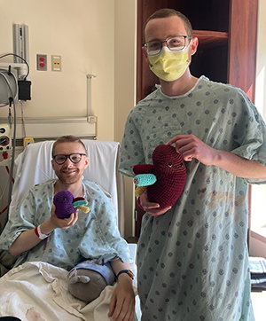 John Nicholas with his kidney donor, Pat Wise, wearing medical gowns in a hospital room and holding toy crocheted kidneys.