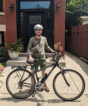 John Nicholas wearing a bike helmet and a brown T-shirt and shorts posing in front of his bike on a sidewalk.